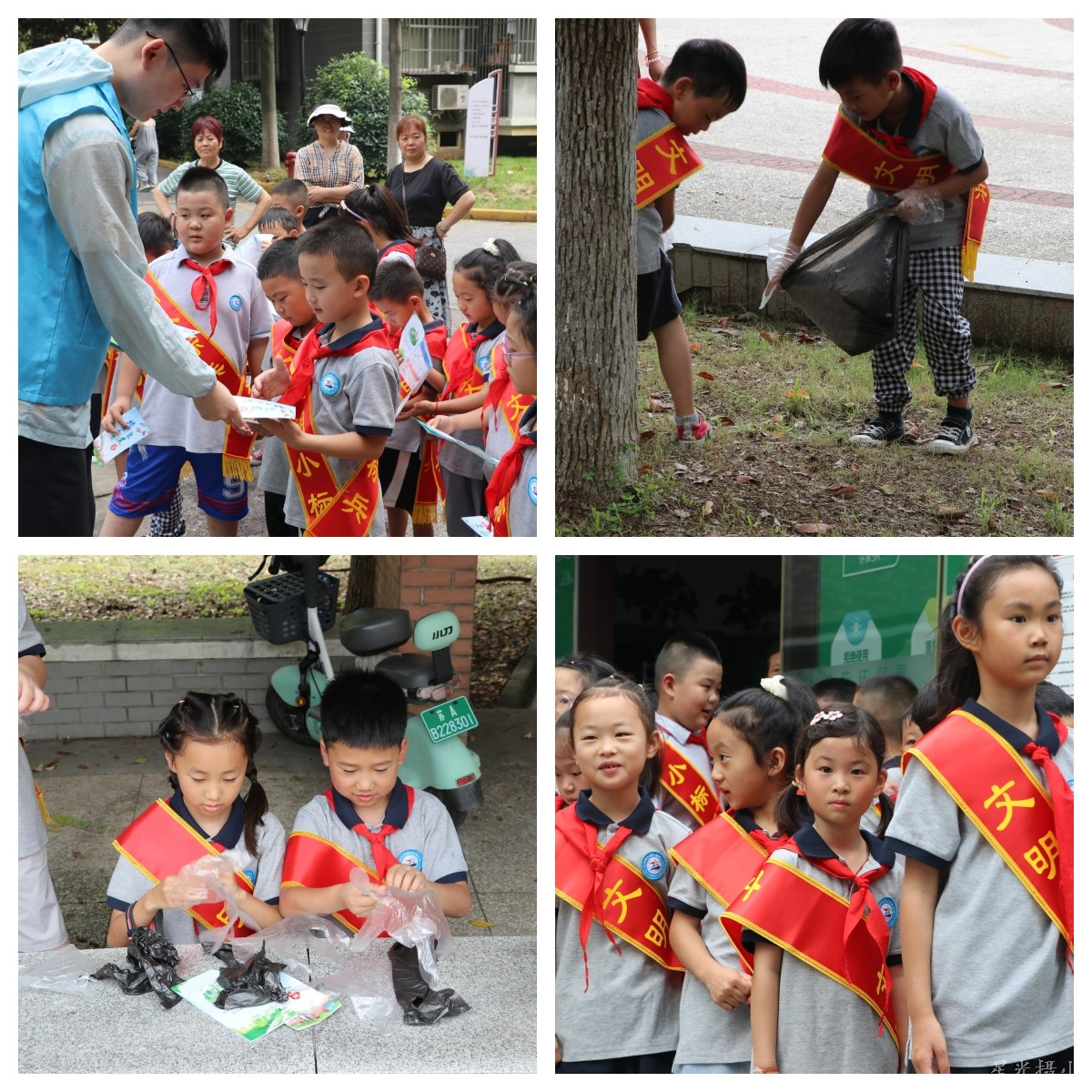 活动中,小红枫身披文明小标兵绶带,社区工作人员向小红枫发放绿色环保手册,并讲解垃圾分类等知识。小红枫们认真学习环保知识及垃圾如何分类,并领取手套等工具后开展户外垃圾清理实践活动,即使天气炎热,也无法阻挡孩子们让环境变得干净的热心。