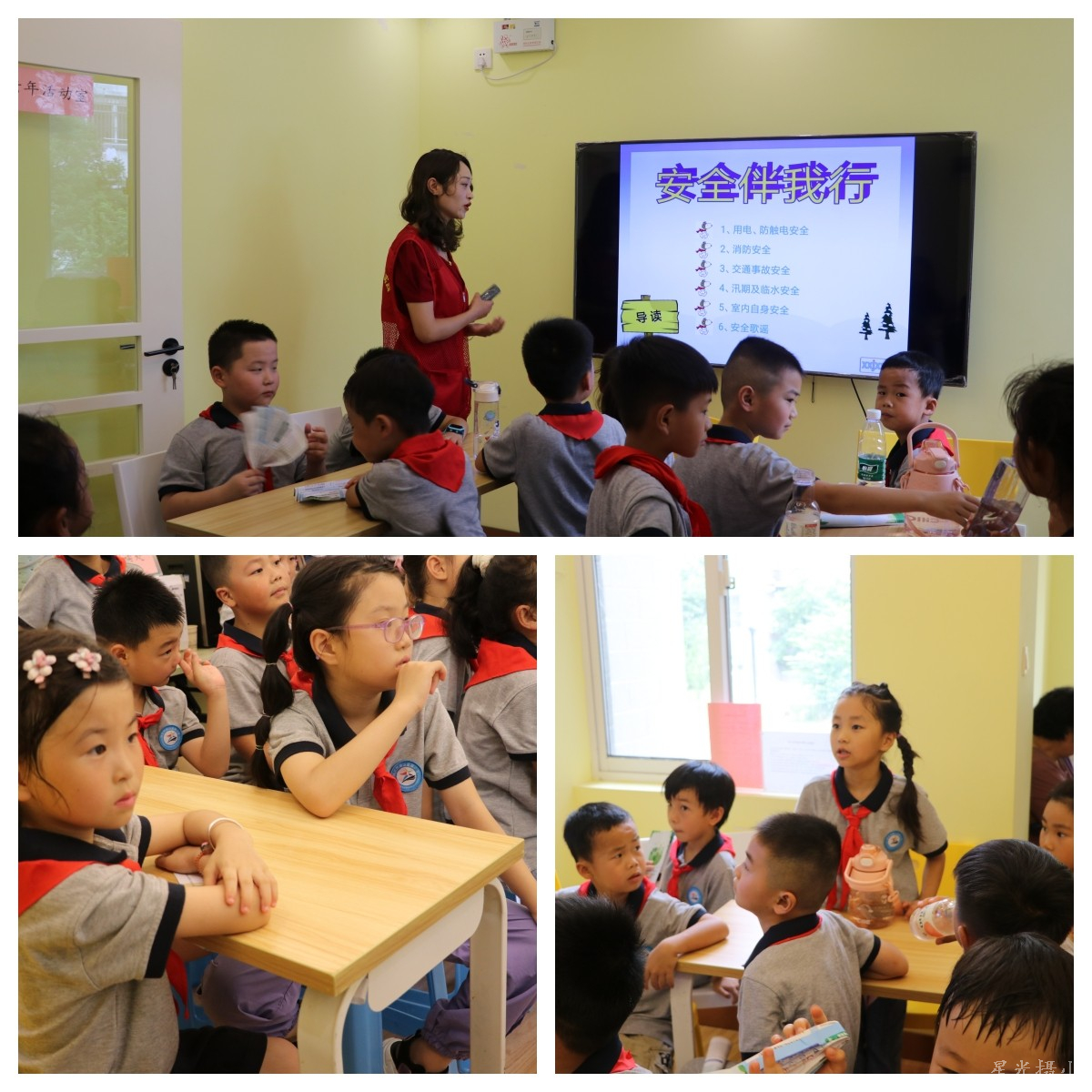 经历户外炎热的天气和激情满满的环保实践后,小红枫一行来到社区活动室,在休息的同时社区人员给小红枫进行安全自护“安全伴我行”知识的学习。活动中,小红枫认真学习安全知识,社区工作人员针对暑假雷雨天气重点讲述。在提问抢答环节,小红枫们踊跃举手回答,各抒己见,学习气氛十分活跃。