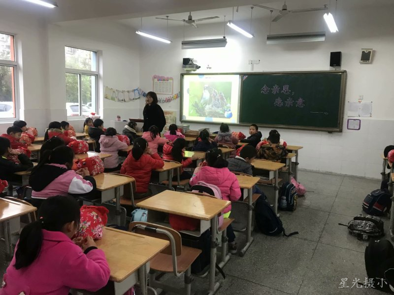 班会课上,各班班主任结合本班的情况,联系生活实际与学生交流自己的观点与认识,引导学生们了解父母、老师的辛劳付出与期盼,让他们感受到家人、老师对自己的关爱,从而激发他们感恩之情。有的班级通过让学生讲述自己的故事,从而感染、引导身边的同学。有的通过视频、创设情境等方法,引导孩子学会感恩,从一点一滴的小事做起。