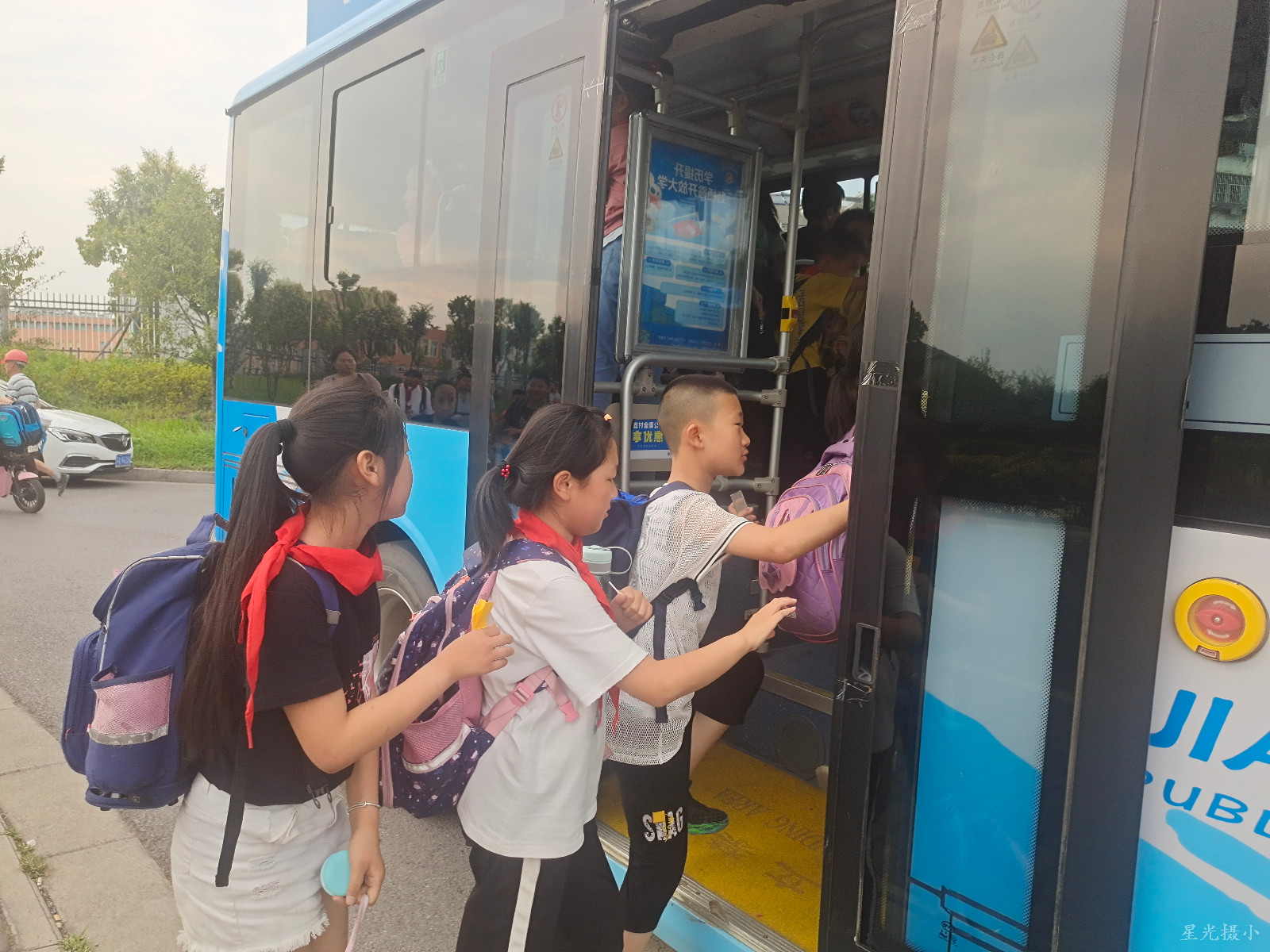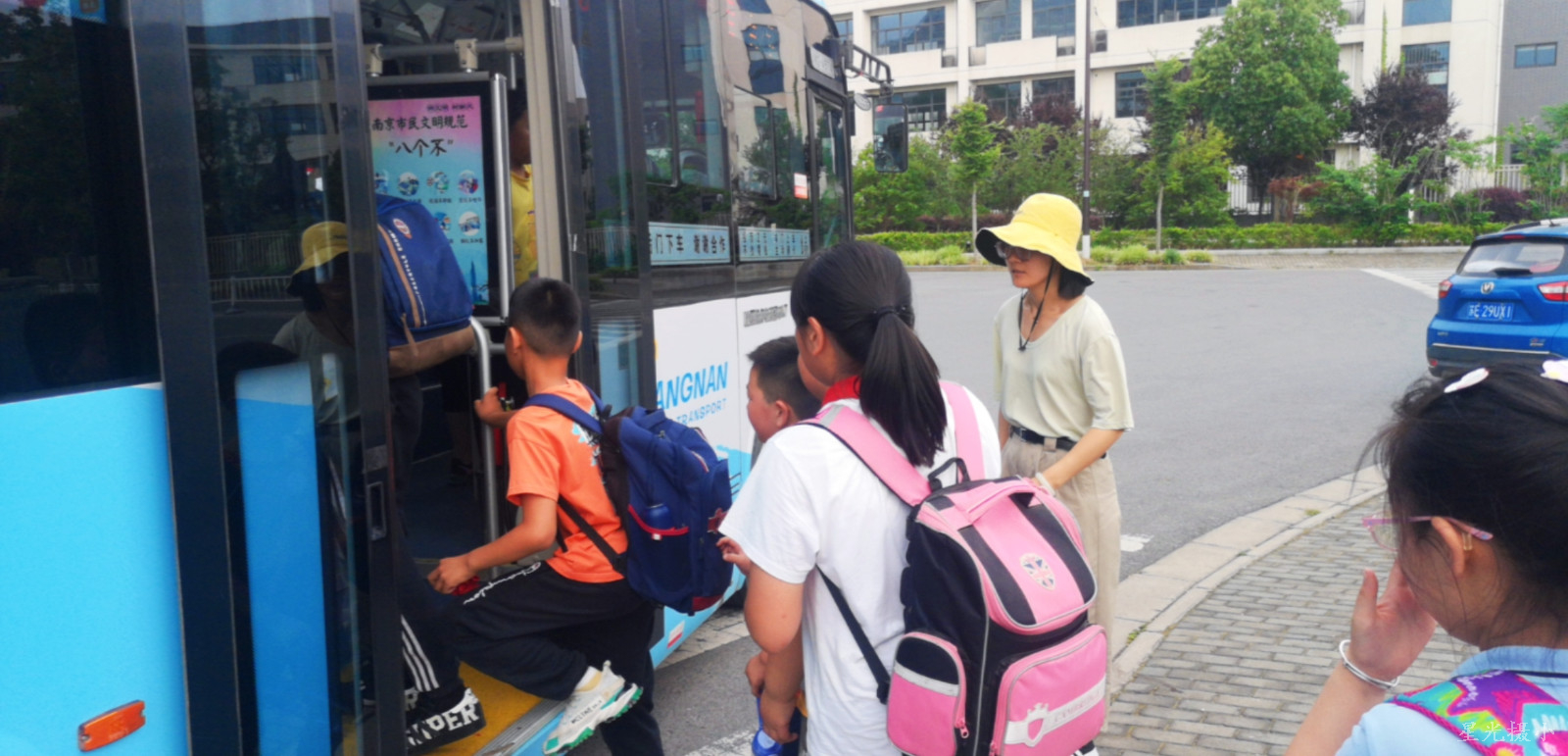 演练开始前,陈卢主任向学生们强调交通安全的重要性和安全乘车要点以及有序上下车的重要性。紧接着,演练正式开始,在工作小组老师的指挥下,同学们排着整齐的路队,遵循“一停,二看,三让”的要求,有秩序的安全通过马路,在陪护老师的引导下有序上车、有序下车。